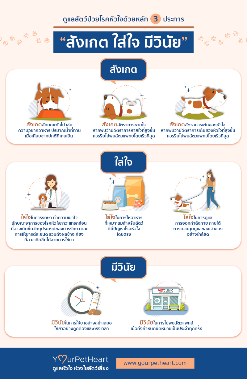 แม้ว่าโรคหัวใจจะเป็นโรคที่ไม่สามารถรักษาให้หายขาดได้ แต่การจัดการดูแลที่เหมาะสมจะช่วยให้สัตว์ป่วยมีคุณภาพชีวิตที่ดีและอายุยืนยาวขึ้นได้ โดยผู้ที่มีบทบาทสำคัญที่สุดในการจัดการดูแลสัตว์ป่วยโรคหัวใจก็คือเจ้าของสัตว์นั่นเอง มาลองดูวิธีการจัดการดูแลสัตว์ป่วยโรคหัวใจง่ายๆ โดยใช้หลัก 3 ประการ ดังนี้